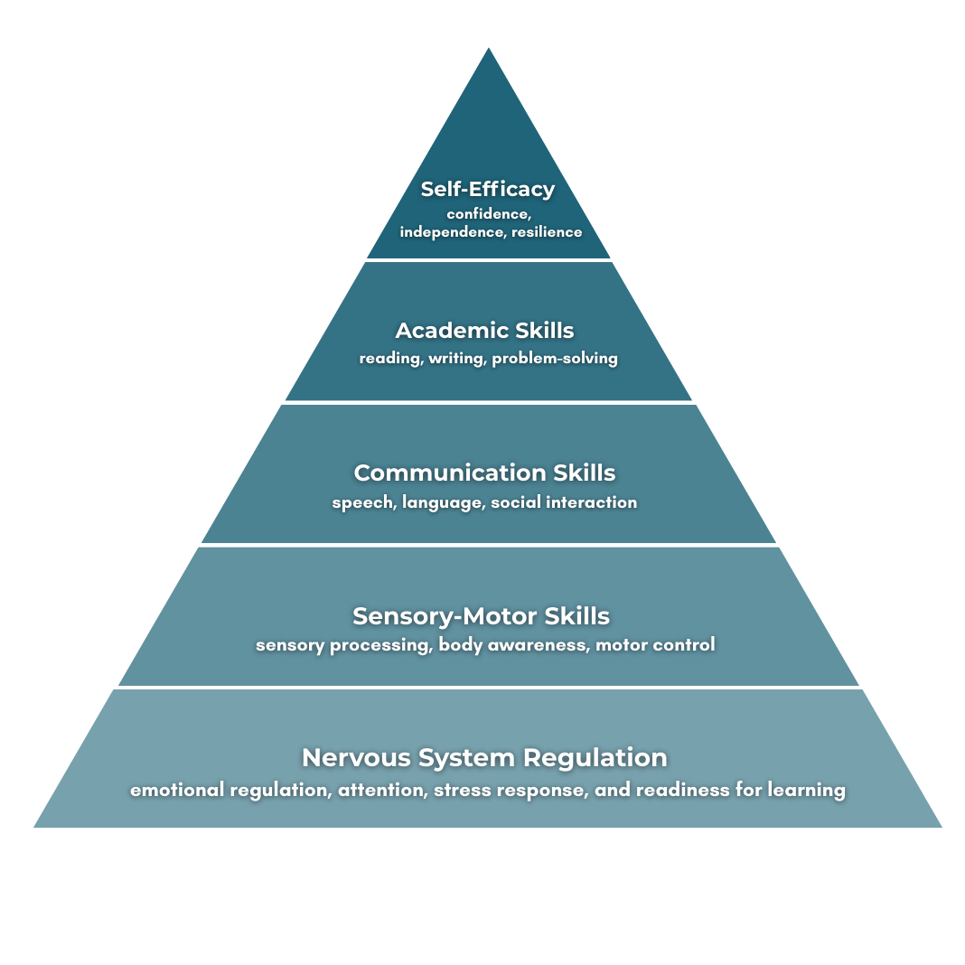 Our developmental approach recognizes that higher-level skills are built on a strong foundation. Just as a pyramid relies on its base for stability, a child’s learning and academic success depend on earlier developing systems.